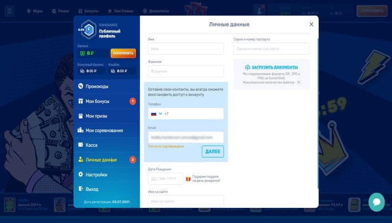 После успешного заполнения анкетных данных и подтверждения по телефону и электронной почте, игрок может полноценно использовать свой аккаунт. Он также получает самый первый бездепозитный бонус на игры.