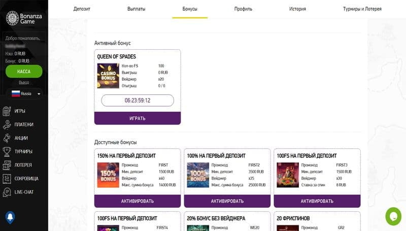 Успешная регистрация в виртуальном казино BonanzaGame может принести геймеру 100 бесплатных вращений барабанов. Это хоть и немного, но и с легкостью можно отыграть, ведь подходят они ко всем игровым автоматам, которые присутствую на проекте. Главное для их получения выполнить все требование для их получения. А доступен бездеп лишь для новых геймеров и только один раз. Это касается, как компьютеров, так и IP-aдpecов. Любые неправомерные действия приведут к блокировке аккаунта навечно.